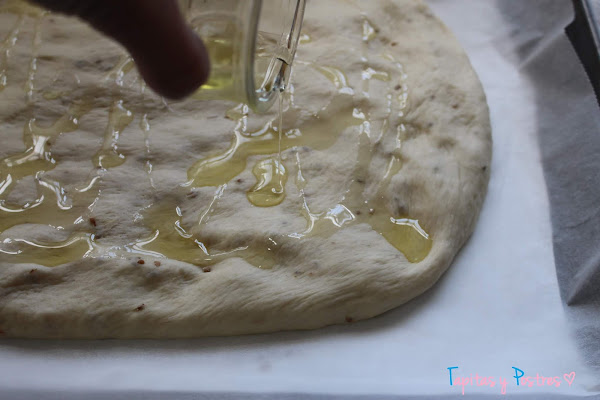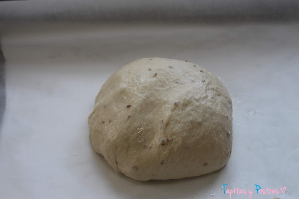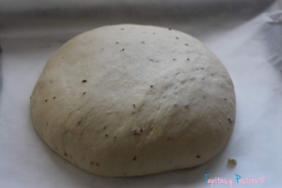 Con las manos aceitadas sacamos la masa y hacemos una bola. La ponemos en una bandeja de horno con papel vegetal y la metemos en el horno apagado que habíamos pre calentado. Dejamos media hora.