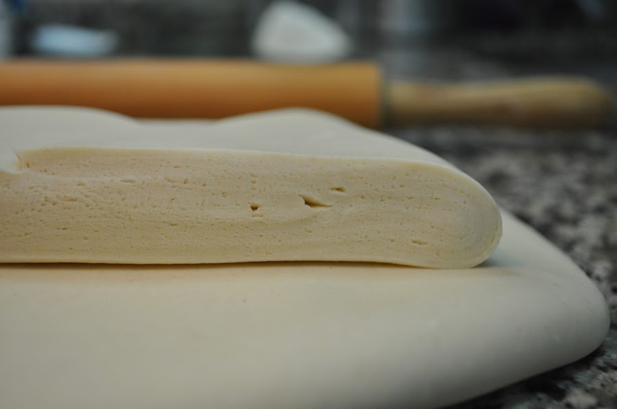 El procedimiento es bastante laborioso. No necesita mucho amasado pero si hay que echar mano de rodillo y plegados, hay que "refinar" la masa lo cual necesita de mucha paciencia.