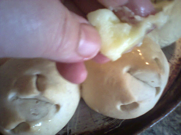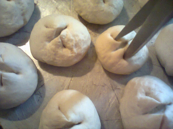 le hacemos unos cortes en cruz con la tijera....cuando están empezando a tomar color les pasamos un poco de grasa por encima y dejamos un ratito mas a dorar.....cuidado con esto por que si doran mucho el pan queda cascarudo, salvo que te guste así.