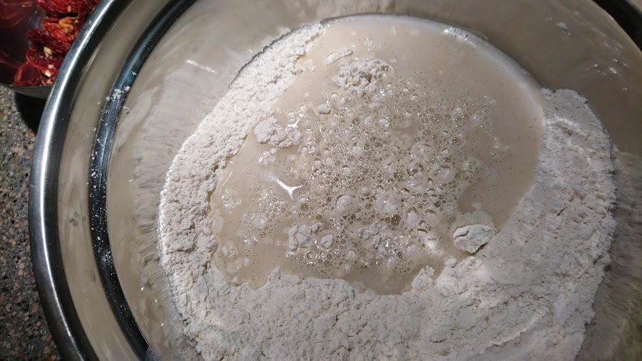 Añadimos la levadura disuelta y el resto del agua. Hacemos una primera mezcla dentro del bol. Que vaya cogiendo cuerpo y vayan actuando los componentes. Dejamos reposar 30 minutos tapado.