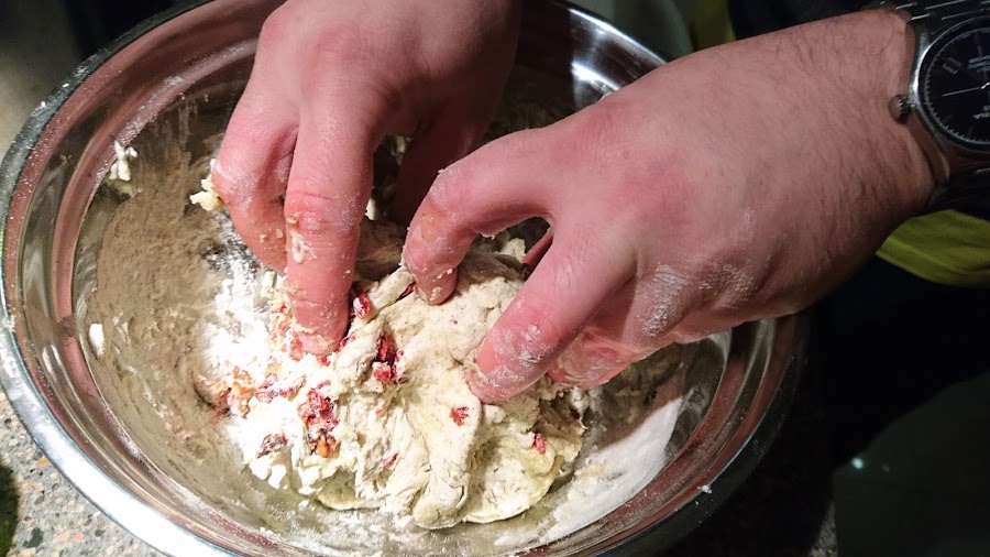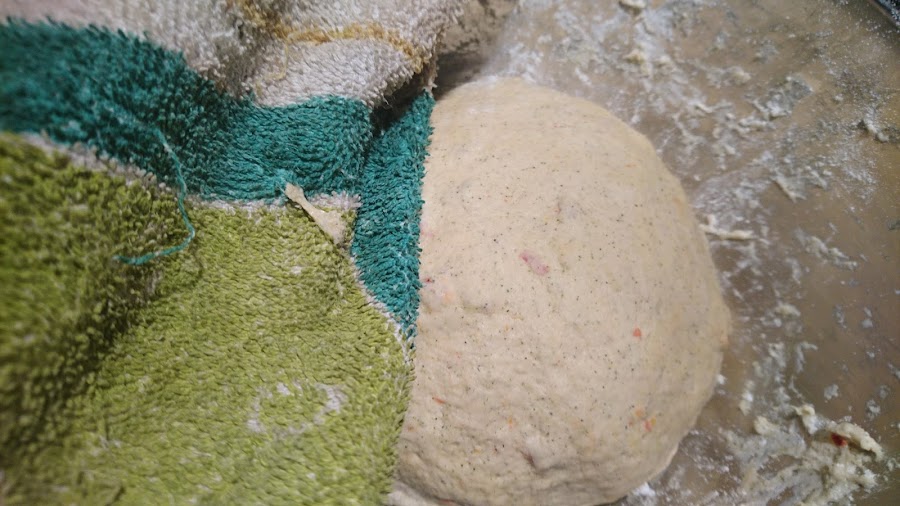 Vamos mezclando y amasando con calma dentro del bol. Lo vertemos en una mesa de trabajo bien lisa y limpia. Ahora toca trabajar hasta obtener una masa homogénea. Hacemos una bola y la colocamos de nuevo en el bol (ligeramente aceitado), cubrimos con un paño y dejamos que repose 1 hora. Sin prisa, a su paso...