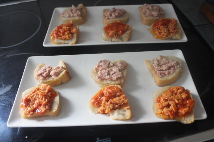 Sobre las otras 6 rebanadas, repartimos el atún en tomate.