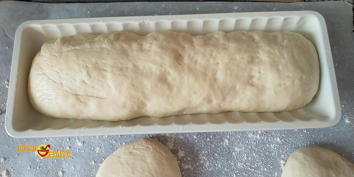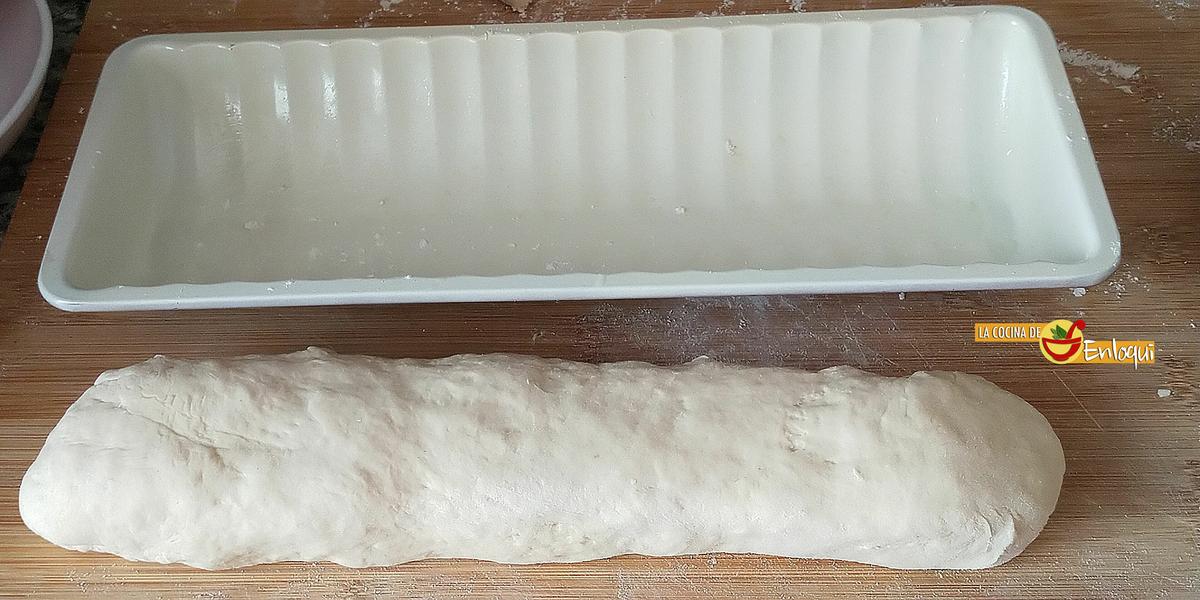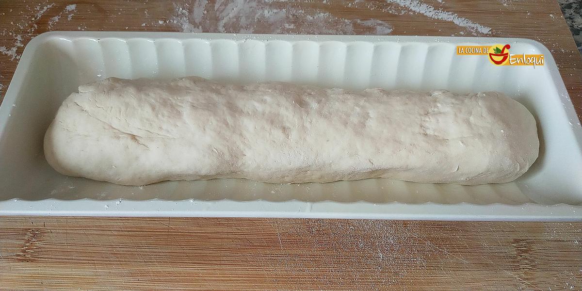Ahora es el momento de dar forma a nuestro pan. Hoy he preparado una barra y cuatro panecillos más pequeños. Para la barra le he dado la forma alargada y he colocado la masa en un molde para pan engrasado con aceite. Pero no es necesario ningún molde. Puedes dar la forma que quieras y colocar sobre papel de horno con un poco de harina espolvoreada. Para los panecillos he hecho 4 bolas de 80 gramos cada una y después he aplastado un poco.Horneado