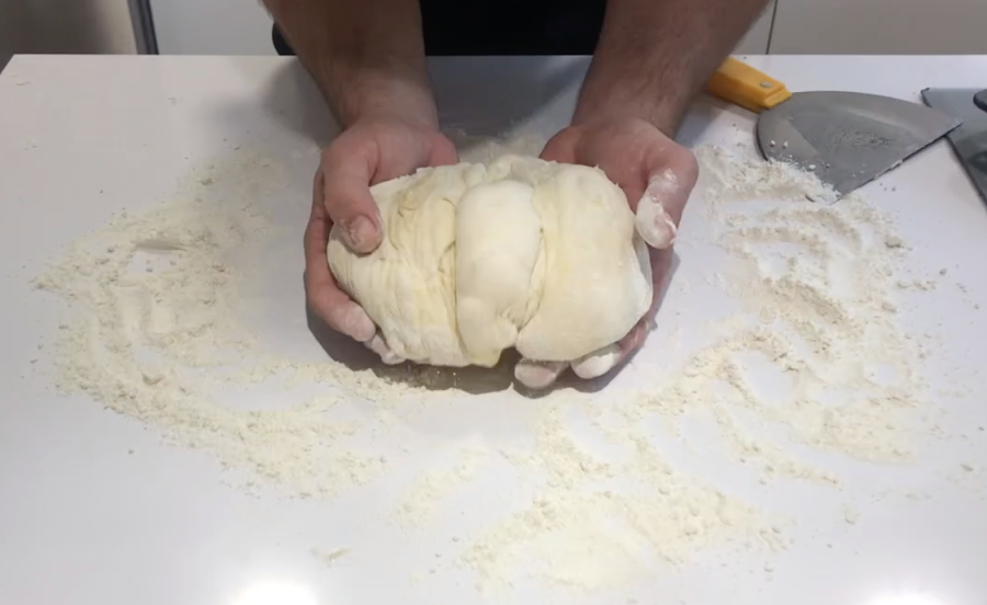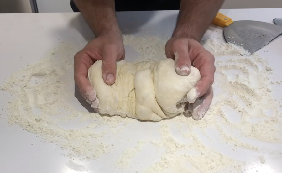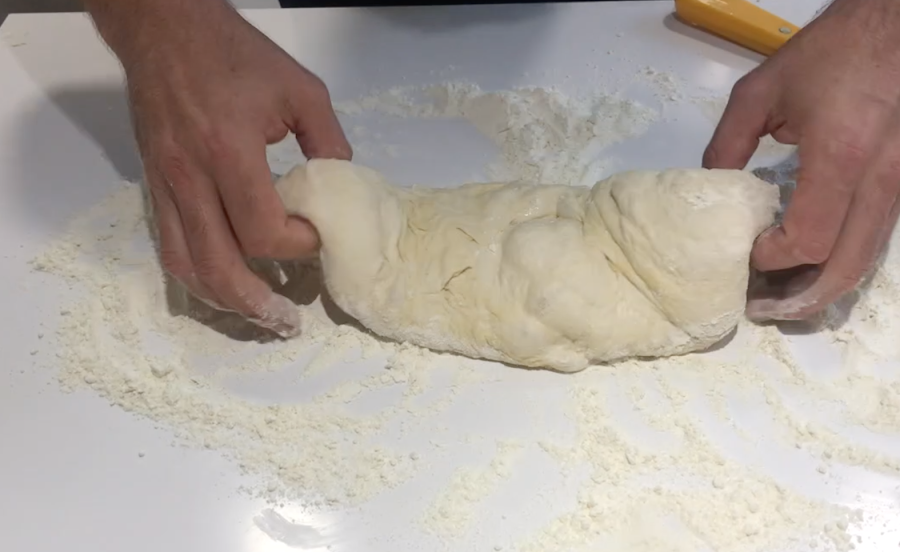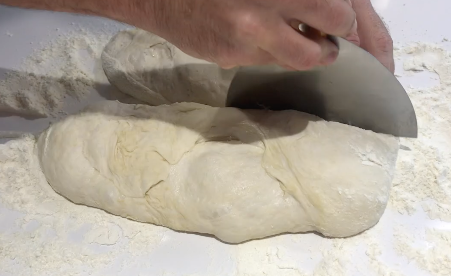 Ponemos harina sobre la mesa de trabajo y cortamos la masa en dos creando dos porras.