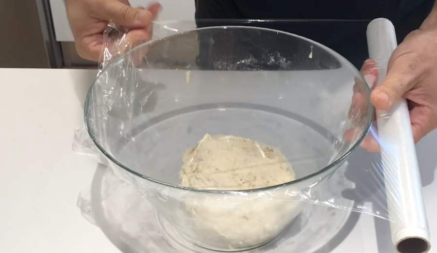 Ponemos papel film y dejamos fermentar lentamente la masa en el frigorífico durante al menos 12 horas.