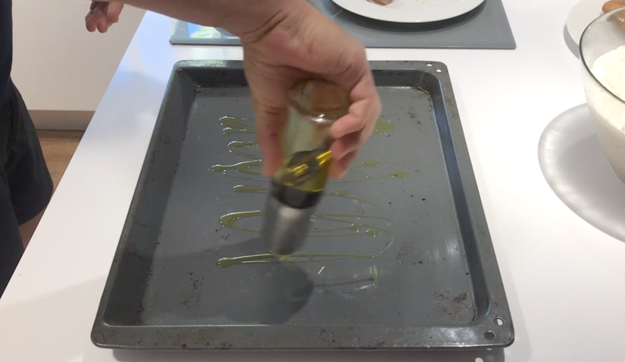 En una bandeja de horno colocamos un buen chorro de aceite de oliva para evitar que así se pegue la masa.