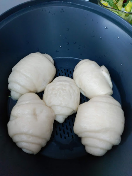 5.- Con cada porcion haces un cilindro de unos 30 cm. (yo lo hice de unos 25 cm) y cuando los tengas todos vas cogiendo uno a uno y con el rodillo haces tiras de unos tres cms. x 60 cms. Cada uno lo enrollas sobre si mismo y los vas colocando repartidos entre el varoma y la bandeja (ojo! que doblan su volumen). Dejas reposar dentro del varoma durante unos 30/40 min o hasta que doblen su volumen.