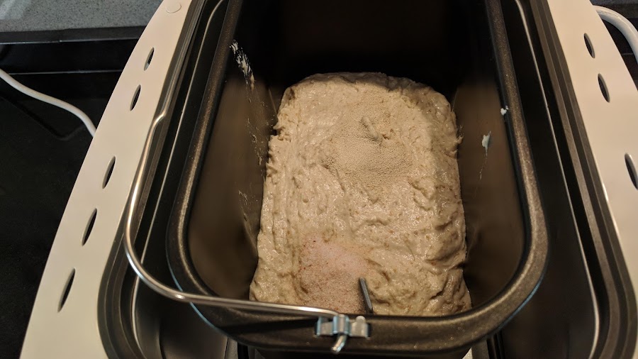 3. Pasado el tiempo agregamos la sal y la levadura y programamos pan normal (programa 1 en panificadora de lidl), peso 1 kilo y tostado fuerte