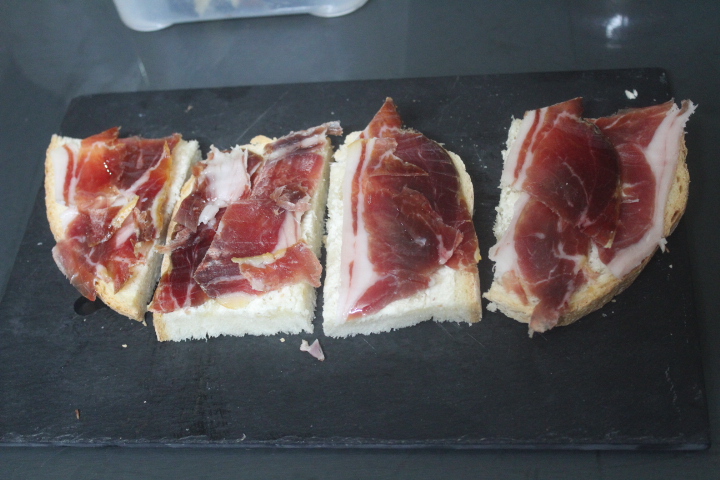 Colocamos las rebanadas en dos platos y cubrimos estas con lonchitas muy finas de jamón.