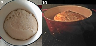 Transcurrida la hora, quitamos la cocotte del horno con cuidado de no quemarnos, y metemos el pan en la cocotte con la doblez hacia arriba de un rápido golpe (9)