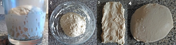 Mezclamos los ingredientes, excepto la sal, y lo dejamos reposar media hora. La masa tiene que quedar ligeramente pegajosa (2); si no se adhiere a las manos, añadimos un poco más de agua.