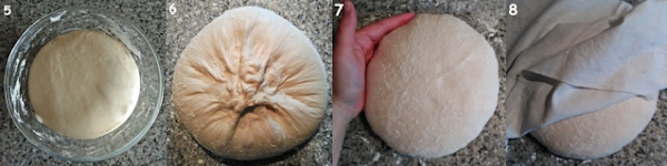 Pasamos la masa a la mesa ligeramente enharinada y hacemos un hatillo con la masa (6); le damos la vuelta apoyándola sobre el punto de unión del hatillo y la boleamos suavemente (7), sin apretar, como si estuviéramos jugando; no queremos que pierda el aire que ha atrapado, y su fermentación no va a ser muy larga. La dejamos reposar boca abajo en la mesa enharinada durante una hora (8)