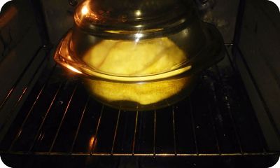 Generalmente pongo la masa en una bolsa de asar, pero el día que lo hice no me quedaba ninguna, así que opté por hacerla en una fuente Pirex con su tapadera.