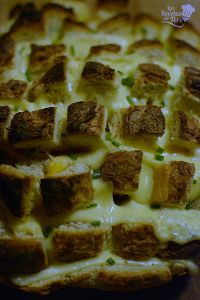 Preparación: Corta el pan con surcos de uno tres centímetros por lado, longitudinales y de `profundidad, en ambos sentidos en ángulo a 90 grados, es decir que la parte superior del pan vaya quedando en cuadros, ten cuidado no hagas los surcos con tanta profundidad que vayas a cortar el pan por su base.