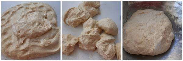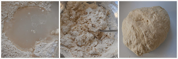 Colocar en un cuenco 2 cucharadas de harina, dos cucharadas de agua y la levadura desmenuzada, mezclar bien hasta obtener una masa. (Ésta va a ser nuestra espuma o masa madre, que luego mezclaremos con el resto de masa). Cubrirla con papel film o una bolsa plástica y dejar reposar hasta que doble su volumen, alrededor de 1 hora. En un bol colocar el resto de harina, con la sal y el agua restante. Unir bien y amasar hasta obtener una masa que no se pegue a los dedos. Cubrir con papel film y dejar reposar 1 hora aproximadamente.