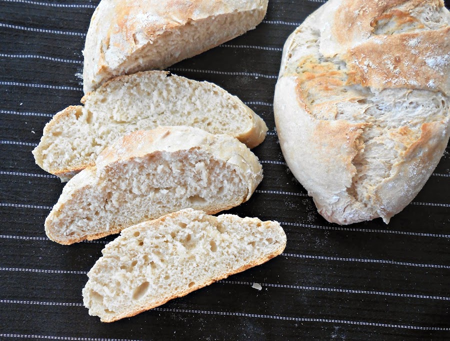 Hacer unos cortes en la parte superior de los panes poner a cocinar a 200º. Una vez que metemos los panes en el horno, agregamos un vaso de agua en la fuente de metal, con cuidado de no quemarnos y dejamos cocinar durante 10 minutos. Quitamos del horno la fuente en la que pusimos agua y dejamos cocinar 10 minutos más. Recuerden que cocino en un horno a gas, con calor sólo de abajo y en la rejilla central.