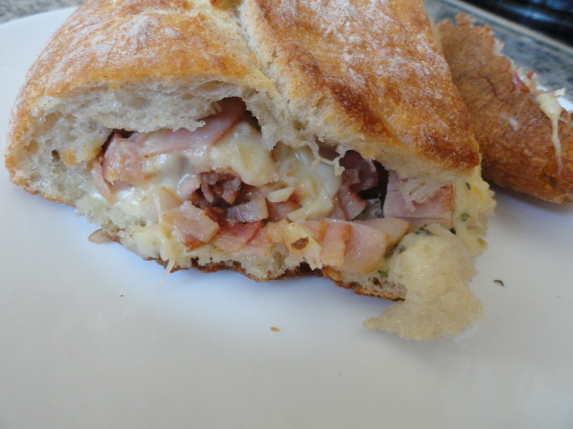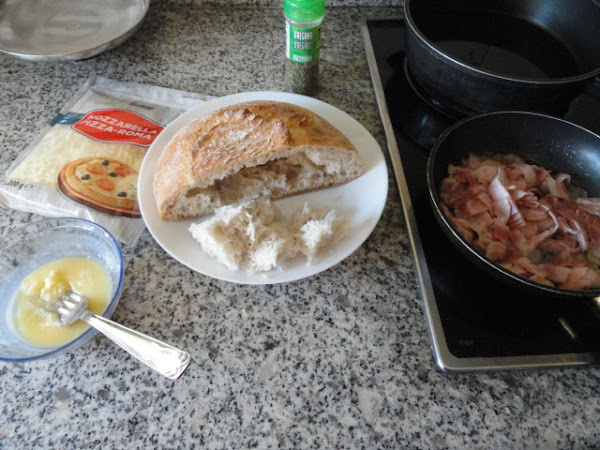Vamos poniendo dentro del pan el bacón, queso, bacón, queso, y cerramos con un poco de la miga qye hemos sacado.
