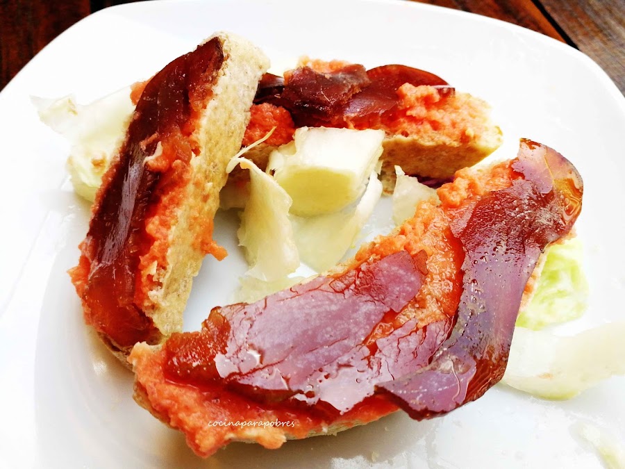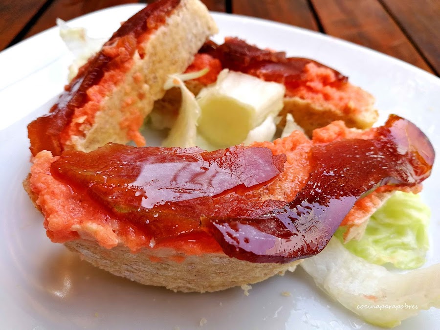 salmorejoCortamos el pan en rebanadas, extendemos sobre esta salmorejo y terminamos colocando una loncha de mojada.