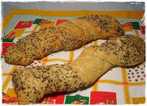 Con cuidado para no desgarrar la masa cogemos cada una de las piezas (podemos cogerlas como si fuera un acordeon, así nos será mas fácil) las pasamos por el trapo humedo y luego por la mezcla de semillas. De ahí las llevamos al papel de hornear. En este momento enroscamos el pan por los extremos y así conseguimos que tenga un poco de forma.