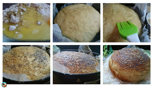 4.- En una taza mezclamos el licor de anís con la harina y el azúcar. Pincelamos el pan con esta mezcla. Esparcimos por encima 1 cucharada se semillas se amapola y una cucharada de semillas de sésamo. Precalentamos el horno a 180º cocinamos en pan 40 minutos. Lo retiramos del horno, lo sacamos del molde y lo dejamos enfriar sobre una rejilla parea que el pan elimine toda la humedad.