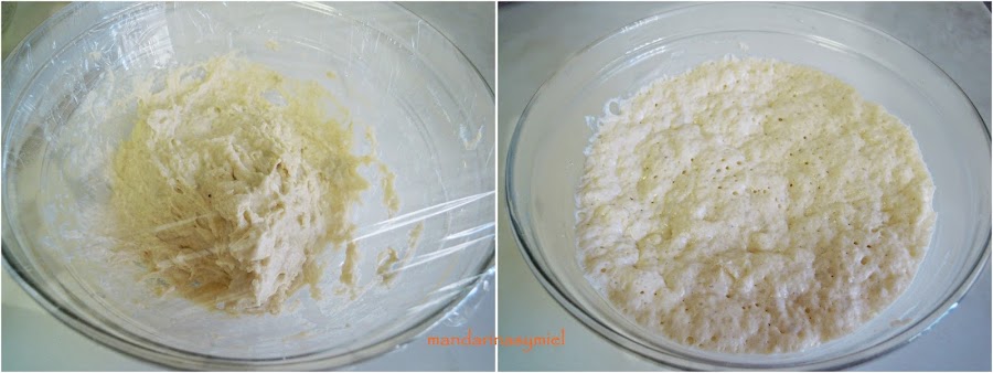 Pon en un bol la harina y añádele el agua con levadura, mezcla hasta obtener una masa pegajosa y un poco cremosa.