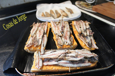 Sobre el tomate colocamos lomos de boquerones, quitándoles la cabeza y la raspa.