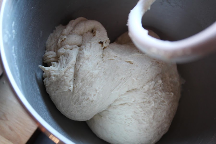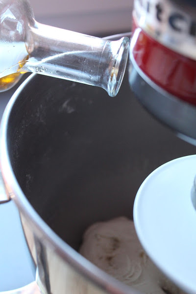 Una vez conseguido este punto, añadimos el aceite, muy poco a poco. Bajamos la velocidad del amasado, hasta que se integra un poco, y volvemos a subir.