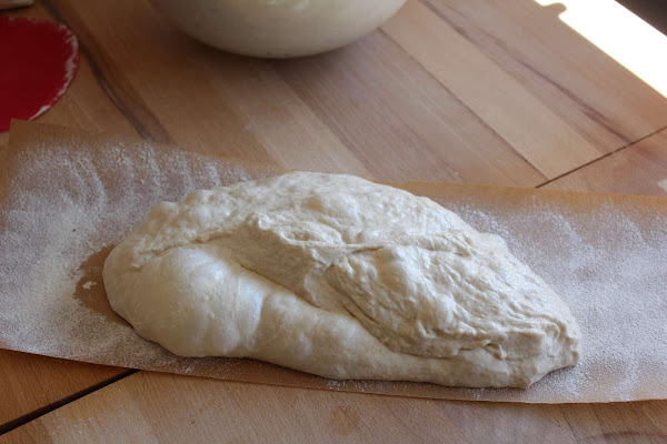 Vamos vertiendo la masa, sobre papel de hornear espolvoreado con harina. Forma panes, sin perder aire.