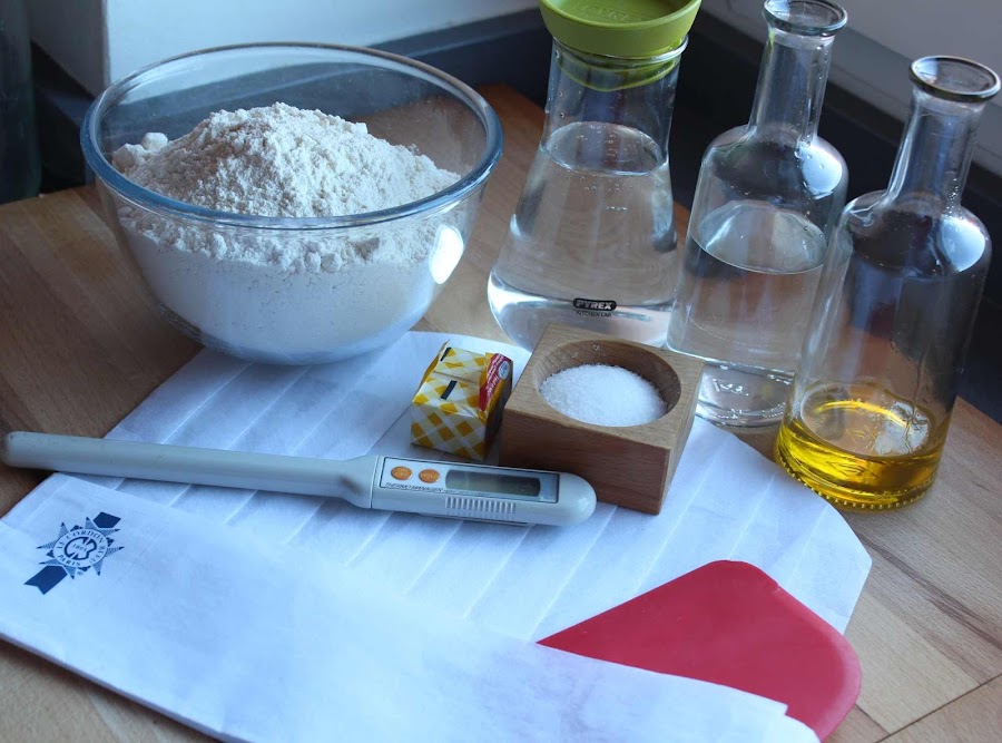 Amasamos, harina, levadura, sal y los 300 gr. de agua a la temperatura que nos marque la formula.