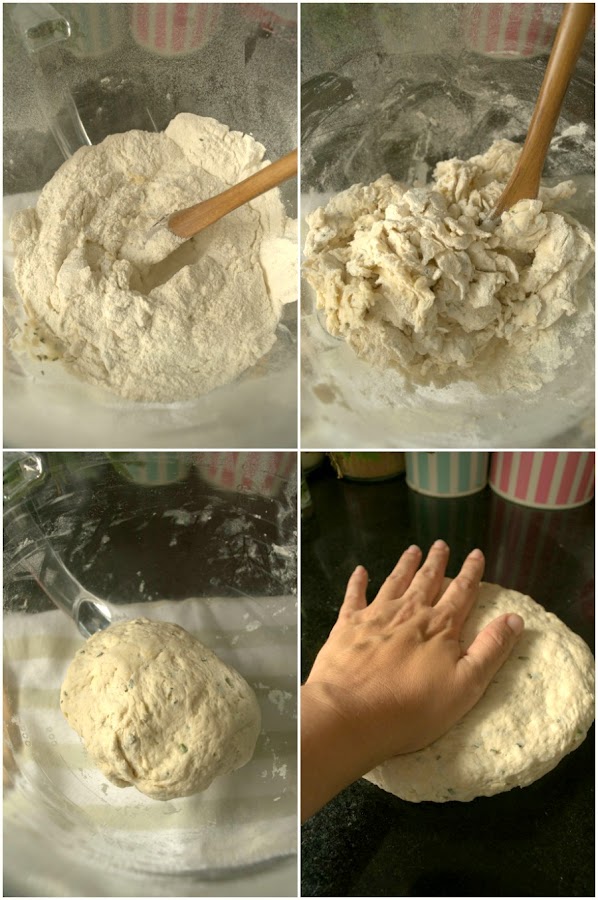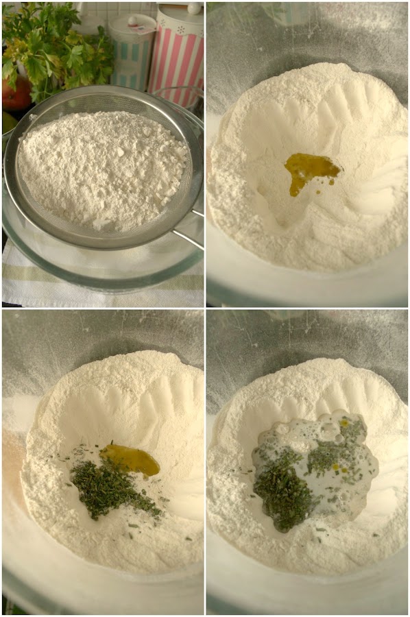 Make a well in the center and add olive oil, chopped rosemary, and lukewarm water.