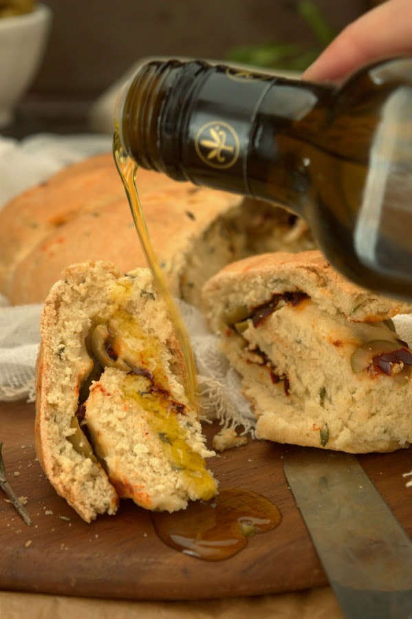 He de decir que lo he tenido que hacer dos veces. La primera vez se quedó un poco crudo por dentro porque había puesto las aceitunas demasiado juntas en el centro, y también demasiado grueso para mi gusto. Todos estos problemas los arreglé en el segundo pan y en la receta os contaré los trucos para que os quede perfecto.