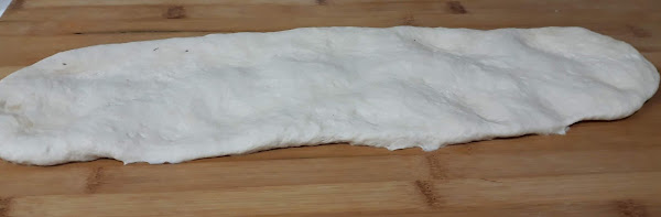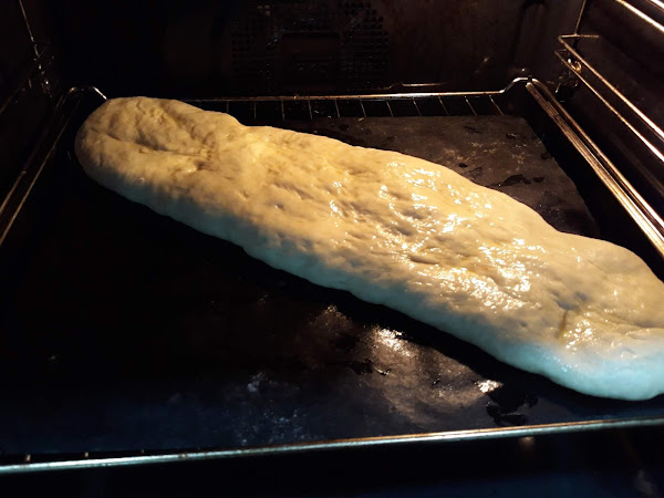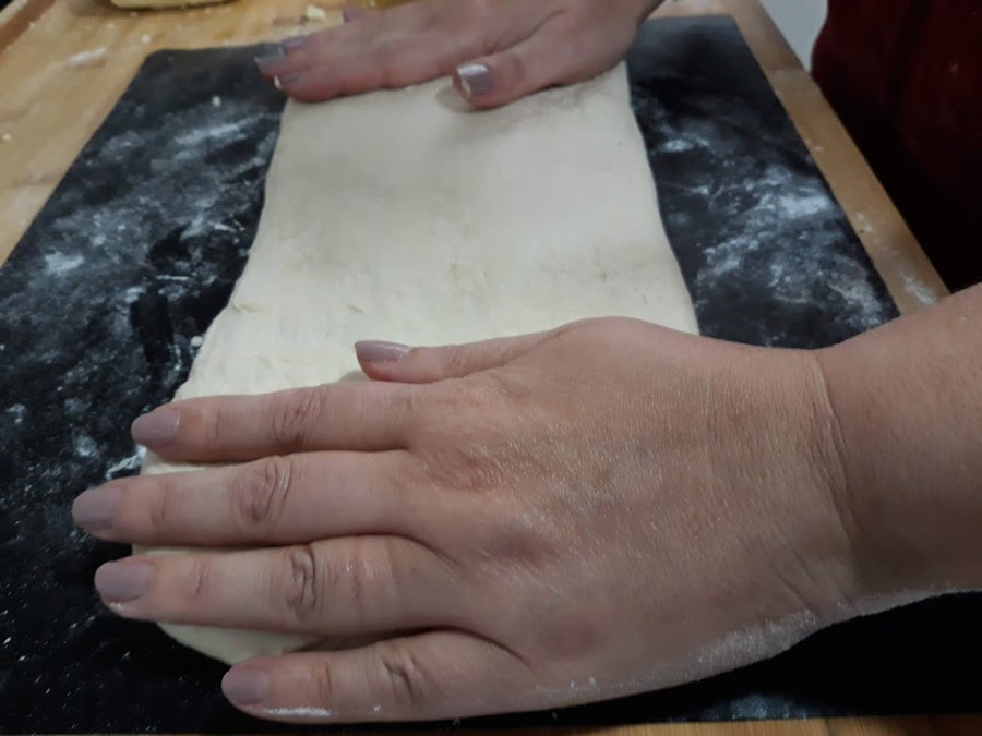 5.- Pasado el tiempo, veremos que ha doblado el volumen y lo que hacemos es darle forma ovalada y al mismo tiempo vamos presionando la masa con los dedos para que tenga un grosor de no más de un centímetro.