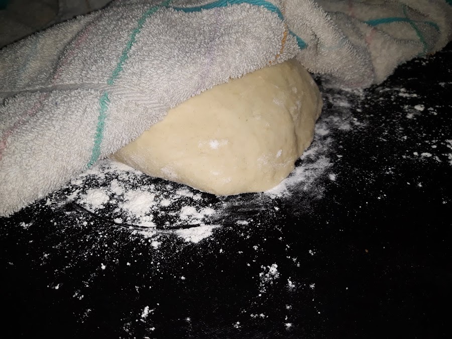 3.- Encima de un papel de hornear, volcamos la masa y le damos forma de bola. La dejamos reposar 20 minutos, tapada con un paño.