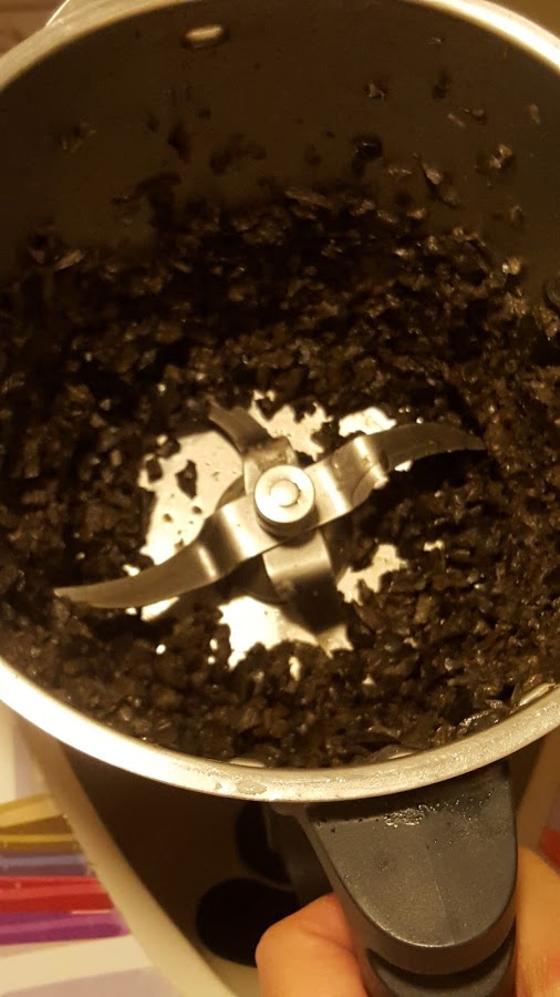 1.- Lo primero que haremos es triturar las aceitunas negras en el vaso de la thermomix 3 segundos, velocidad 5. Reservamos.