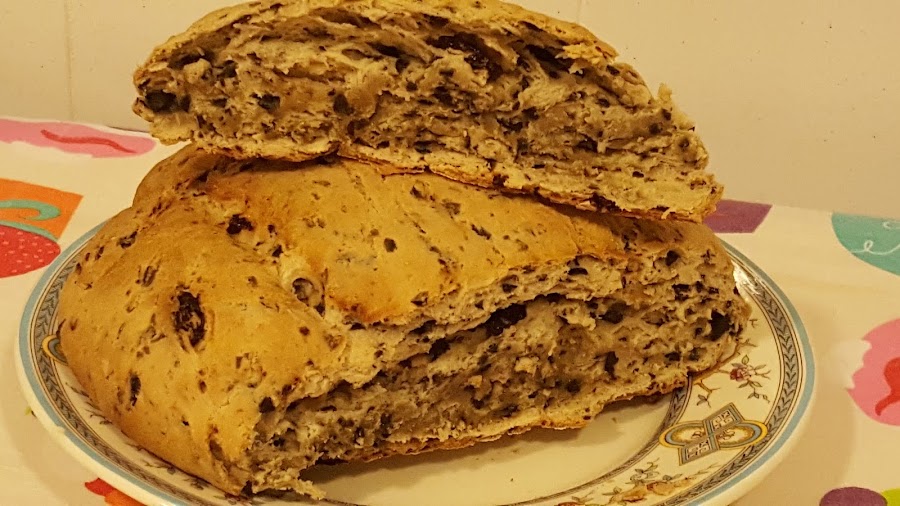 4.- Después añadimos las aceitunas reservadas y las pasas, y volvemos a amasar un minuto, vaso cerrado, velocidad espiga.
