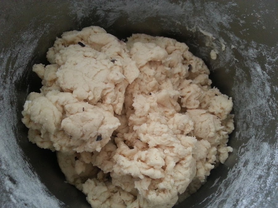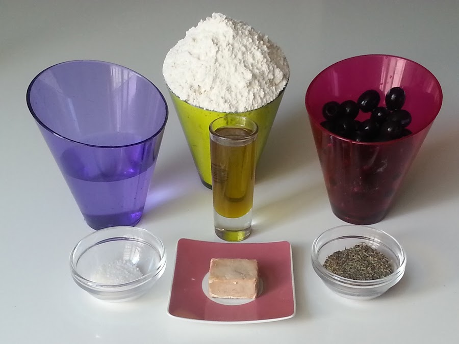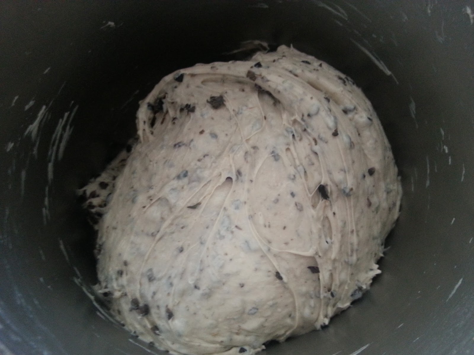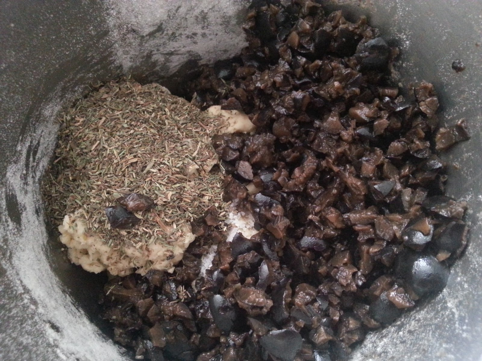4. - Agregamos por último el tomillo, la sal y las aceitunas que habíamos reservado y amasamos bien durante 4 o 5 minutos. O ponemos 3 minutos velocidad espiga.