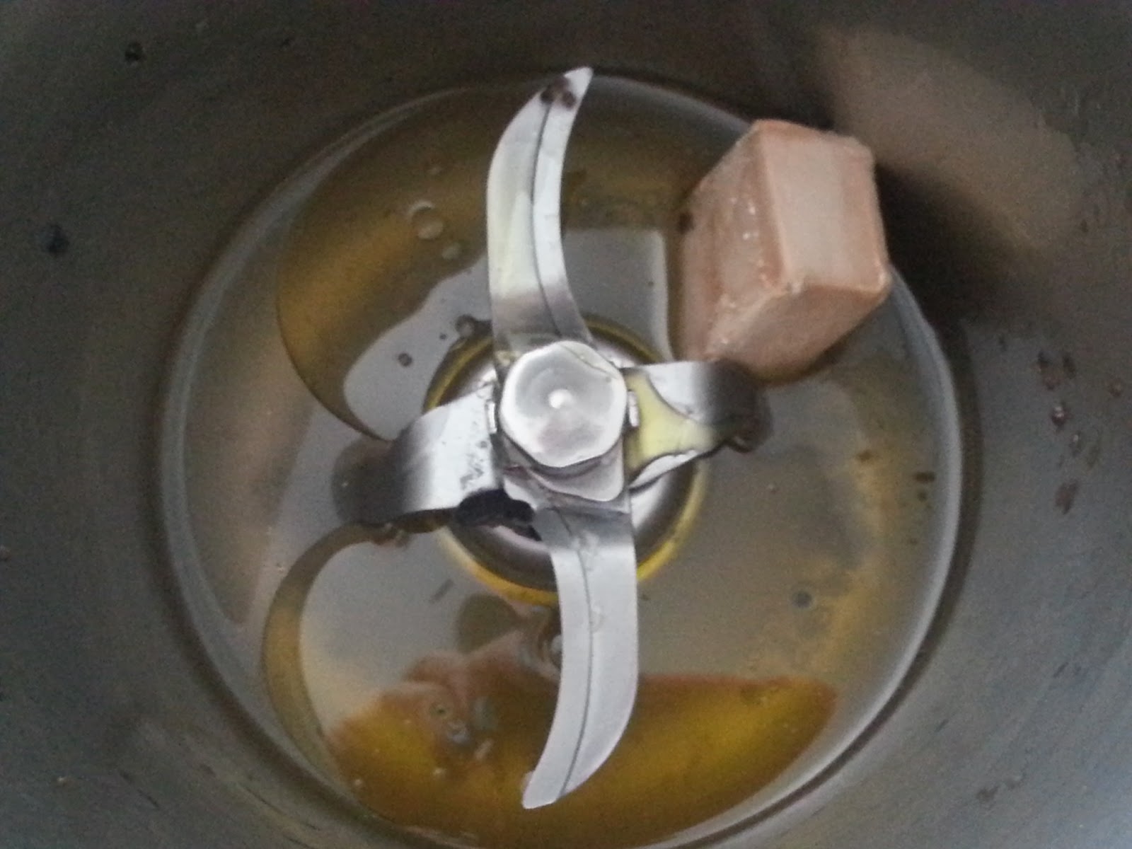2. - Mezclamos el agua caliente con la levadura y el aceite y removemos bien hasta que se diluya la levadura por completo. En la termo programamos 2 minutos, temperatura 40º, velocidad 1.