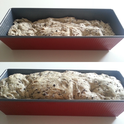 6. - Pasamos a un molde engrasado con aceite y dejamos tapado otros 30 minutos, veréis cómo crece.