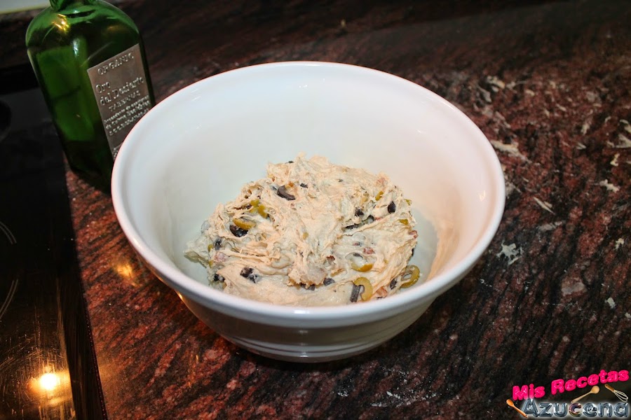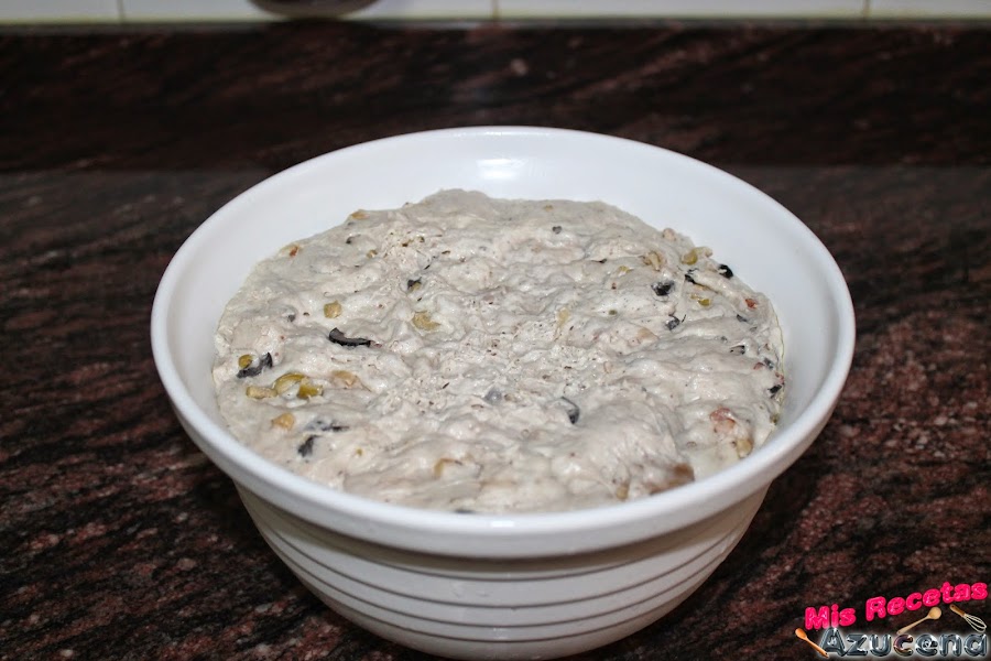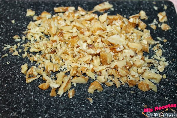 Las nueces las picaremos un poco y las añadiremos al bol junto con el beicon y las aceitunas, removemos bien, tapamos con film transparente y lo meteremos dos horas mínimo en la nevera hasta que esté bien frio.
