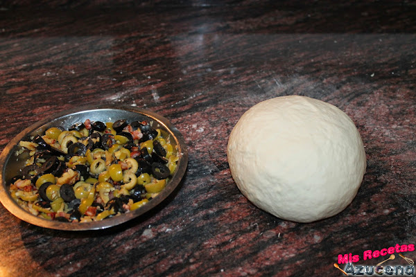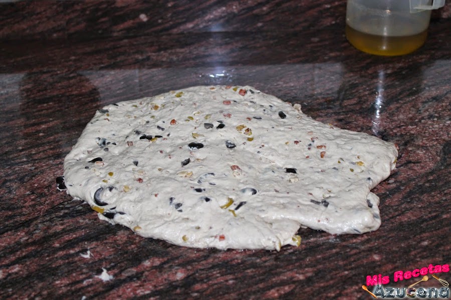 Untaremos un poco de aceite en la barra de la cocina y pondremos la masa de pan y la extenderemos con ayuda de nuestros dedos, solo presionando un poco, la dejaremos 30 minutos para que se le quite el frio de la nevera y podamos trabajarla.