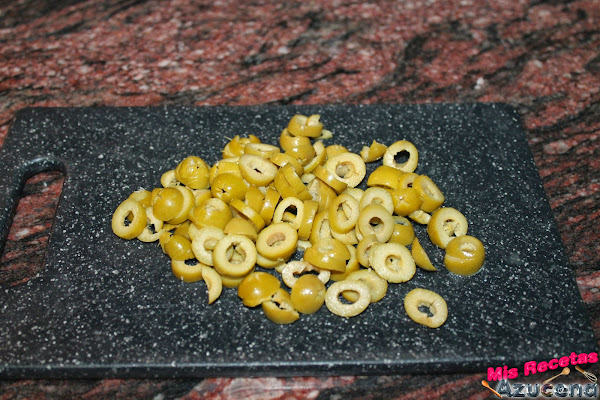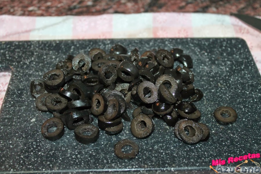 Ahora picaremos las aceitunas en rodajas y las pondremos junto con el beicon.