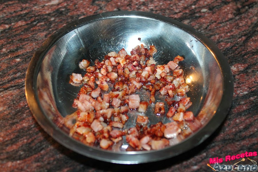 Lo primero que haremos será picar el beicon en trozos pequeños, ponemos una sartén al fuego, a fuego medio, cuando este caliente pondremos un poco de aceite y el beicon, lo dejaremos hasta que esté bien dorado, una vez listo retiramos del fuego y lo ponemos en un bol.