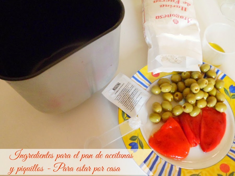 Teniendo en cuenta lo anterior, pondremos dentro de la cubeta el agua, el chorrito de aceite de oliva, las aceitunas (bien escurridas), los pimientos de piquillo (les habremos quitado las pepitas y escurrido) la harina, la sal es un extremo de la cubeta y la levadura en el otro extremo o en el centro.