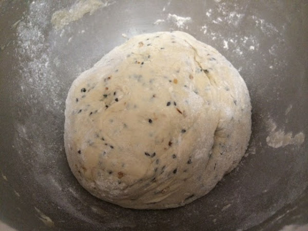 Como siempre que hacemos pan, los ingredientes son casi los mismos (harina, agua, sal y levadura), pero a este pan le hemos añadido además ajo en polvo (de el que venden en la sección de especias), cebolla frita (tipo a la que venden en el ikea) y sésamo negro (opcional).