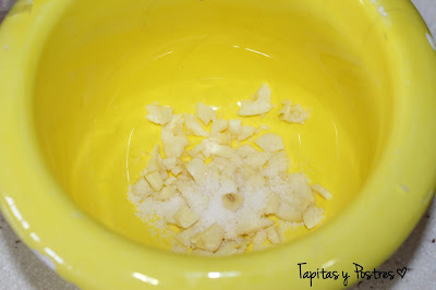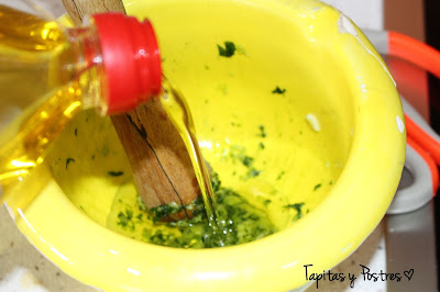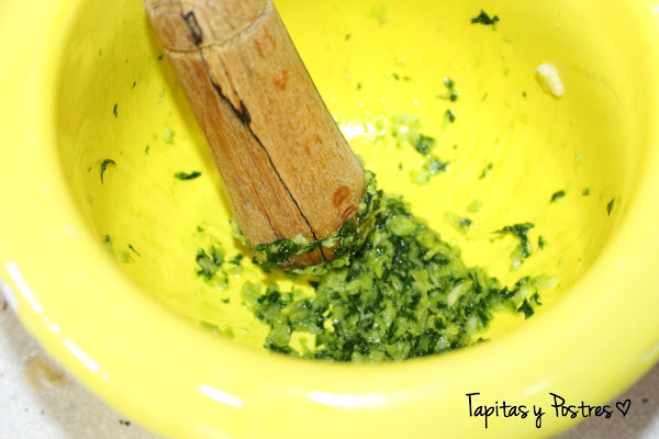 Cogemos 1 o 2 dientes de ajo a los que le quitamos el centro.Los troceamos y ponemos con la sal en el mortero.