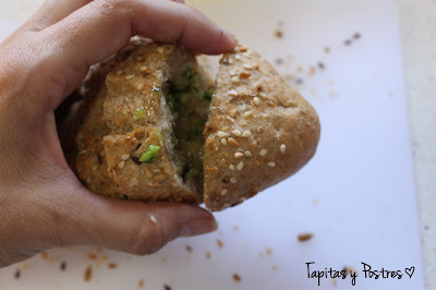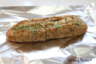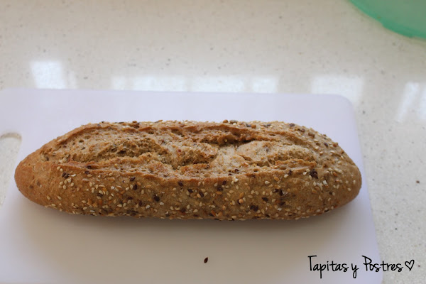 Normalmente la hago con una baguete o barra de viena, pero tenía esta barrita de pan con semillas y probé a ver como quedaba. El contraste es fantástico, la corteza crujiente, la miga suave y sabrosa...¡un gusto!