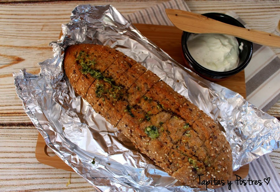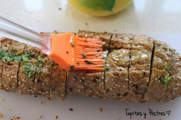 Cortamos el pan en rodajas gruesas sin llegar al final. Untamos por medio con la pasta.