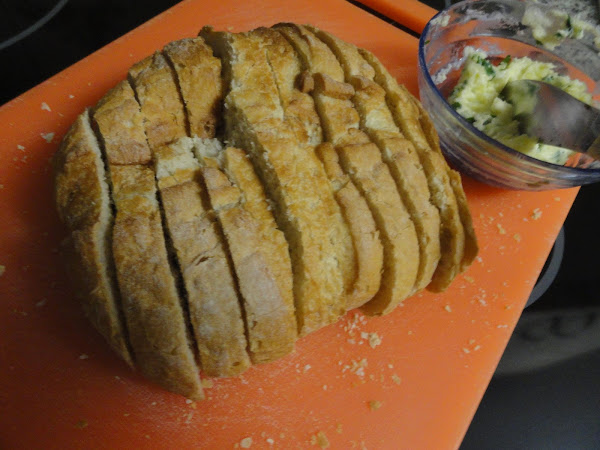 Cortamos el pan en rodajas y untamos con la mezcla anterior por uno de los lados y vamos formando otra vez la pieza de pan. La mantequilla nos sirve de "pegamento". Envolvemos en papel aluminio y lo ponemos al horno unos 10-15 minutos. Y lo tomamos calentito.