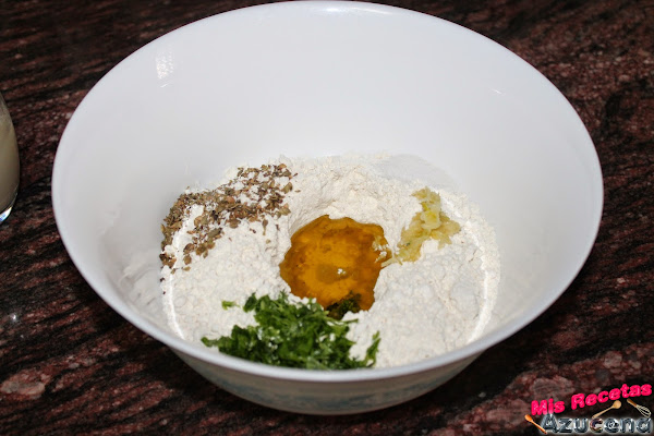 Ahora en un bol pondremos la harina, haremos una especie de volcán, en uno de los lados pondremos la sal, en el otro el orégano, en el centro pondremos el aceite.