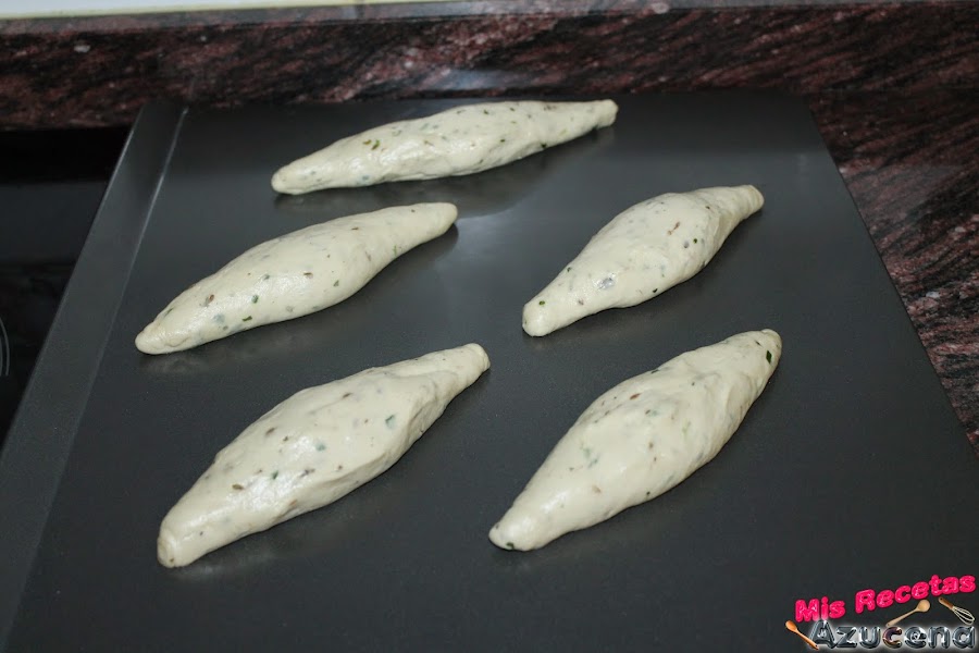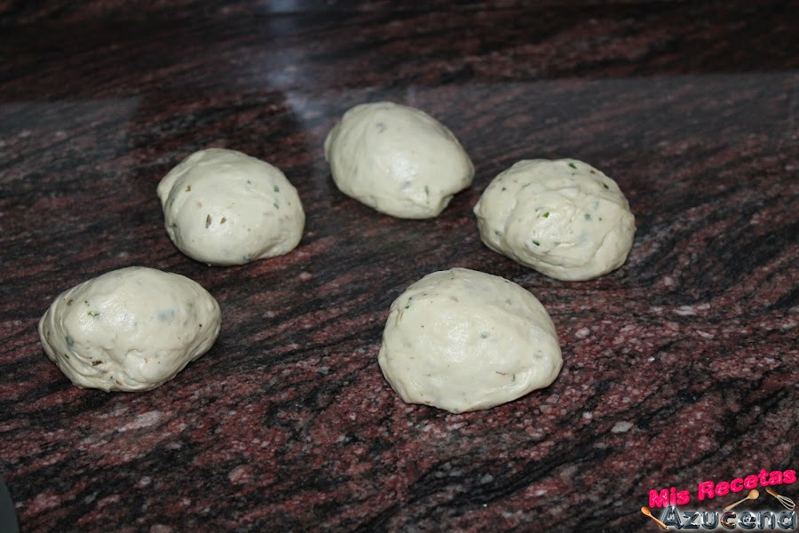 Ahora dividiremos la masa en 5 partes de unos 90 gramos cada una, cogemos una de las partes y formaremos panecillos, cada vez que formemos uno lo pondremos sobre la bandeja que tengamos pensado hornearlos, en esta bandeja le pondremos una lámina antiadherente para horno, una vez tengamos todos los panes formados, los taparemos un trapo y los dejaremos reposar en el sitio más cálido que tengamos durante 1 hora.